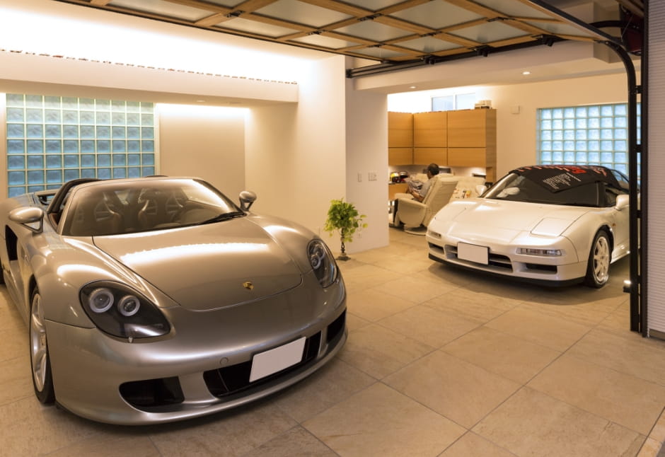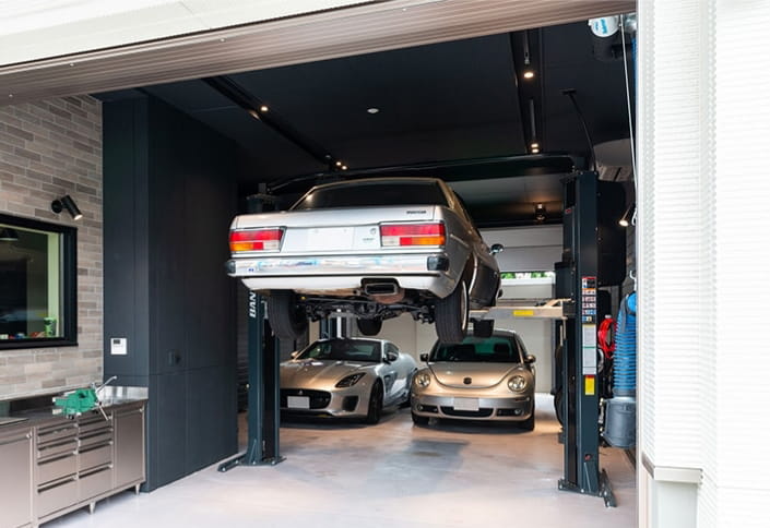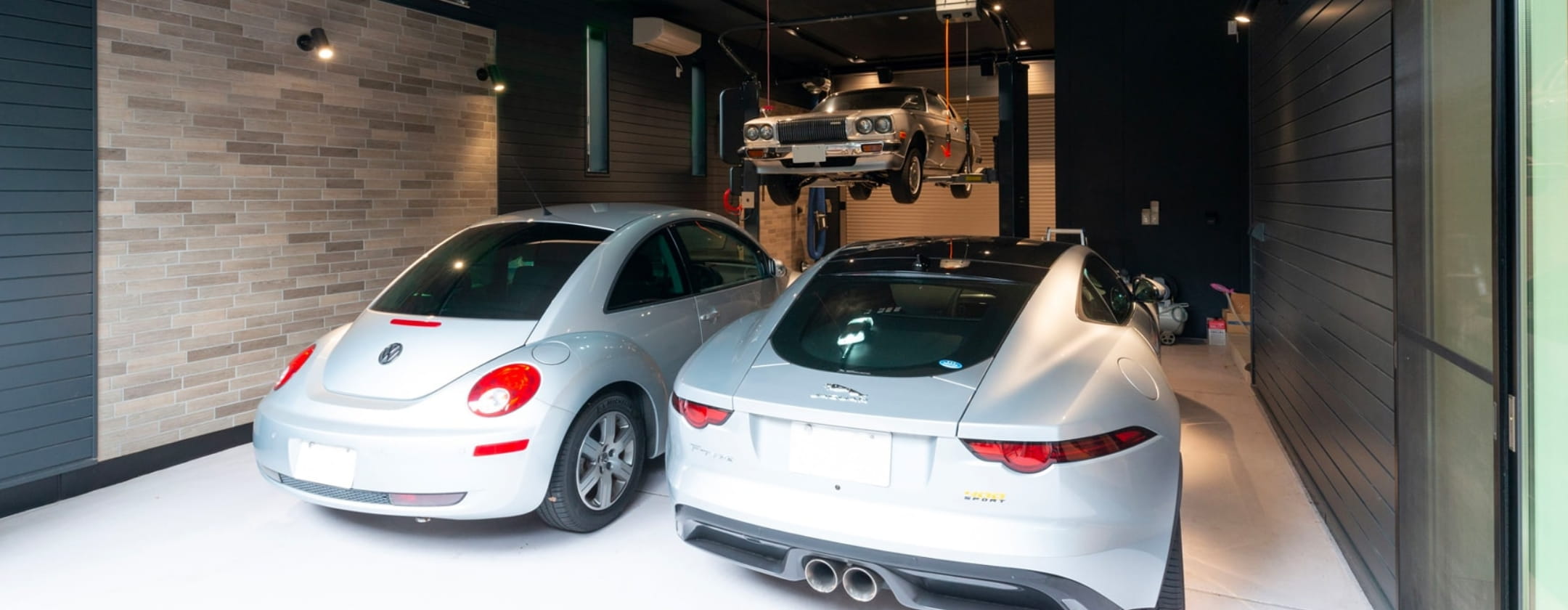 それぞれの世帯が快適に過ごせることに加えてK様が重視したのが、インナーガレージです。所有する5台の車を格納し、ご自身が愛車を眺めながらくつろぐことができるソファスペースを確保。床の目地のつながりまでこだわってデザインした空間は、まるでショールームのような雰囲気に仕上がっています。